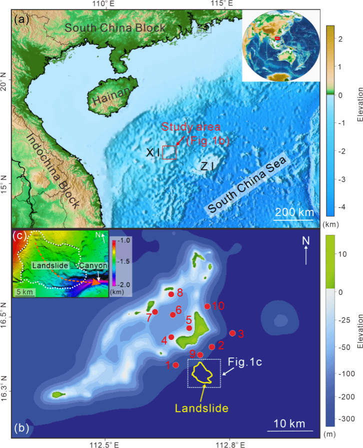 随着南海沿线城市化与基础设施建设的快速发展,海啸对人口密集区和关键设施的威胁日益凸显,特别是由海底滑坡引发的海啸,往往因其传播过程中的复杂相互作用而导致难以预测的灾难性后果。在群岛区域,岛礁形态可能进一步放大海啸的影响。研究以南海西沙群岛的一处典型海底滑坡为案例,基于多波束测深数据构建真实的海底滑坡情景,采用非静水波浪模型与完全非线性波浪模型耦合的方法,模拟了海底滑坡引发海啸的产生与传播过程。