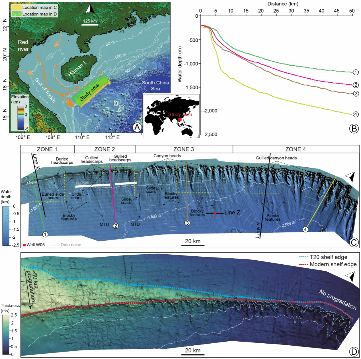图1.A)南海北部区域图以及表层输运方向。(B)位于图C的水深剖面图(彩色线条1–4)。(C)海底水深图,显示主要沉积/侵蚀地貌特征。(D)海底至T20层位地层厚度平面图