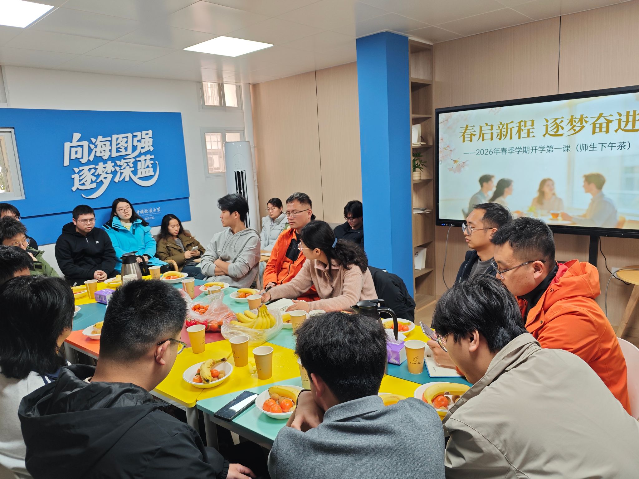 在55栋公寓社区驿站举办2026年春季学期开学第一课暨第二十期师生下午茶。成人游戏党委副书记钟苹、2022级班主任匡洋民、于男参加活动。团委书记、辅导员陈波主持活动。