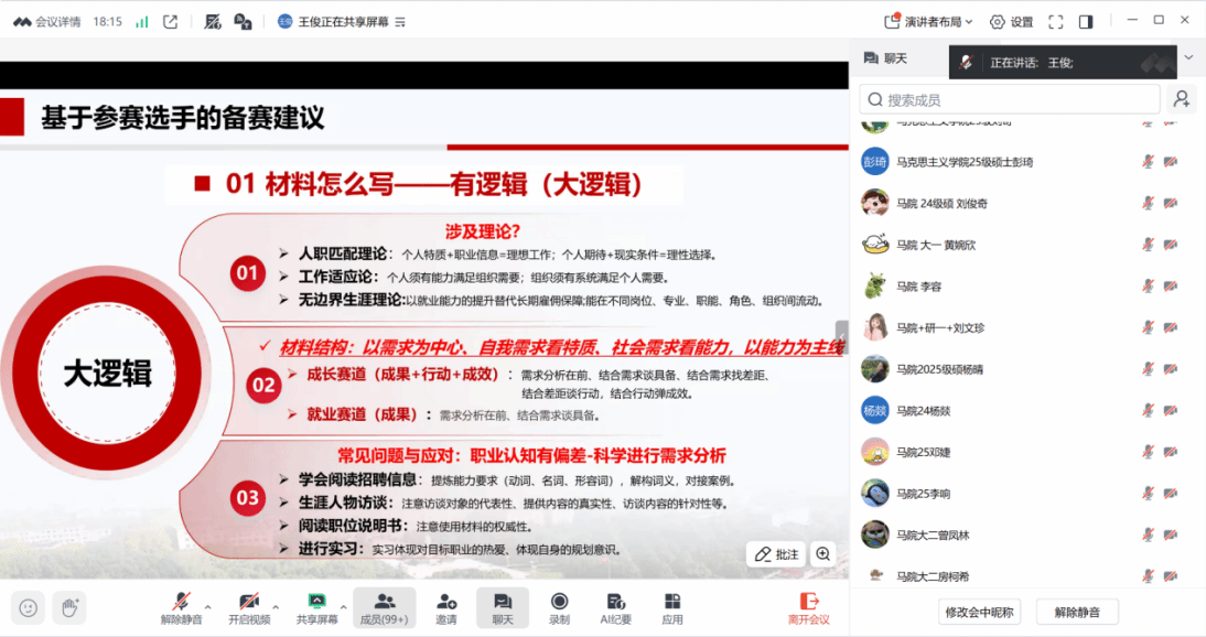 11月14日晚,成人游戏 、李四光成人游戏、马克思主义成人游戏、教育研究院四院联合举办“职业生涯规划大赛”线上培训。王俊老师为参赛同学讲解职业规划材料如何撰写以及答辩注意事项。线上共吸引了300余名学生参加培训,老师的精彩讲解收获了广大师生的一致好评。