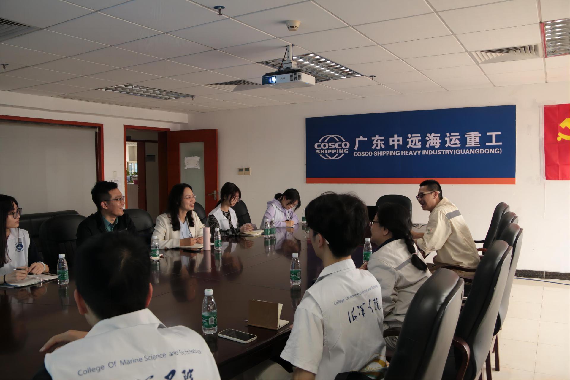 党委副书记钟苹、团委书记陈波携10名优秀学生代表赴广东中远海运重工进行访企拓岗。广东中远海运重工团委书记郭煜宏,人事招聘高级主管赖莹莹、陈圳铮等单位代表参会交流。