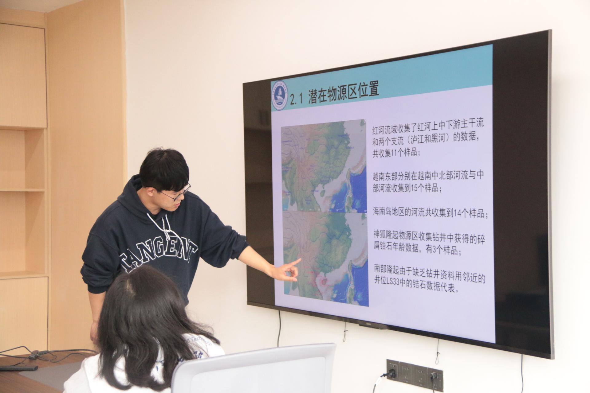 来自学校与广州海洋地质调查局联培的夏安康,张雨斐、孟小暄、戴炜力、伍永林、王坤、阎少妮、王世勋八位研究生同学分别就《海洋溶解甲烷及其海气交换通量研究进展》、《南海北部硫酸盐-甲烷转换带深度变化的运动机制调研》、《菲律宾海铁锰沉积物地球化学分析及讨论》、《海南岛三亚湾与红塘湾砂质海岸岸滩变化特征》、《对基于波动方程的模型正演》、《琼东南盆地晚渐新世-中中新世物源演化》、《琼东南盆地第四纪块体搬运沉积(MTD)的沉积特征、控制因素及其与水合物藏的关系》、《海洋碳封存及应用前景》展开了汇报。同学们精神饱满、思路清晰,向与会师生详细讲解了各自的海洋研究课题与成果,并与参会同学展开热烈讨论。