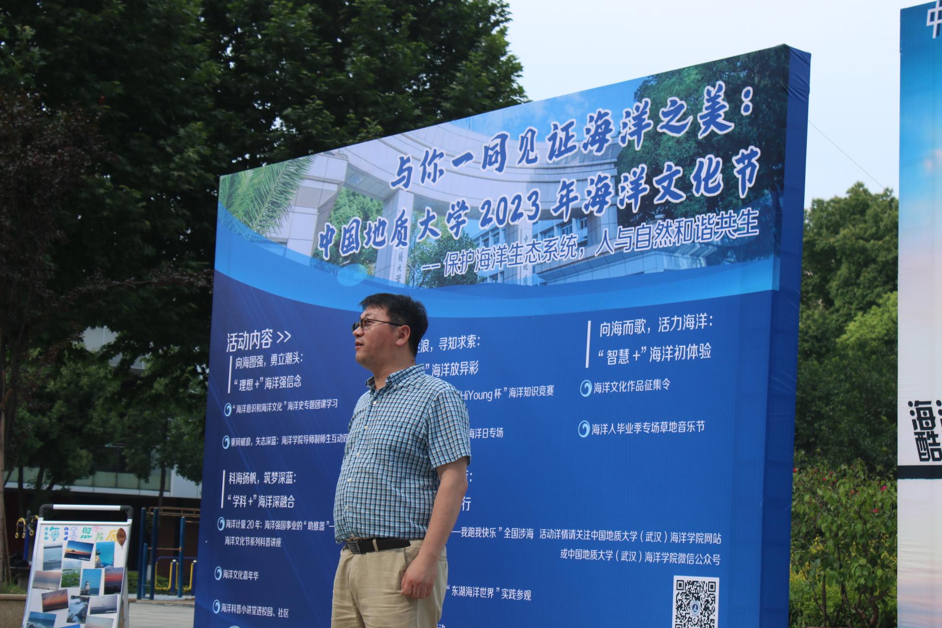 副院长、湖北省荆楚好老师陈刚出席启动仪式并致辞。他指出,从青藏高原到长江出海口,河流最终都将汇入大海,我们的日常生活与海洋息息相关。去年自己同学校师生再赴青藏高原开展第二次大学生长江源科考,和十年前相比,长江源头的生态环境明显更好了。希望广大同学能以慢跑活动为契机,继续关心海洋、热爱海洋、经略海洋,学习海洋知识,在求知的海洋里遨游,为祖国海洋强国建设添砖加瓦。