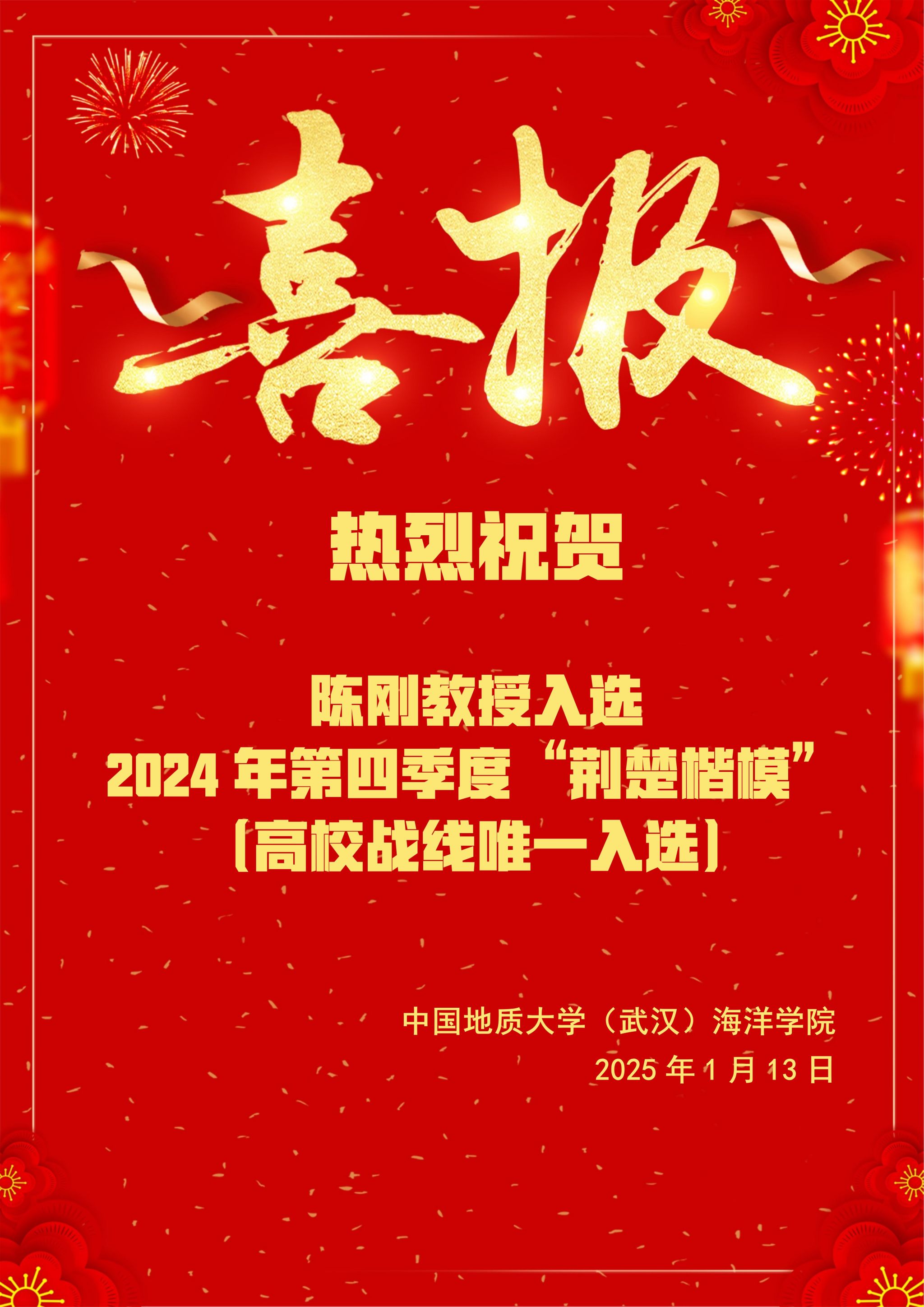 祝贺陈刚教授入选2024年第四季度“荆楚楷模”,是高校战线唯一入选。