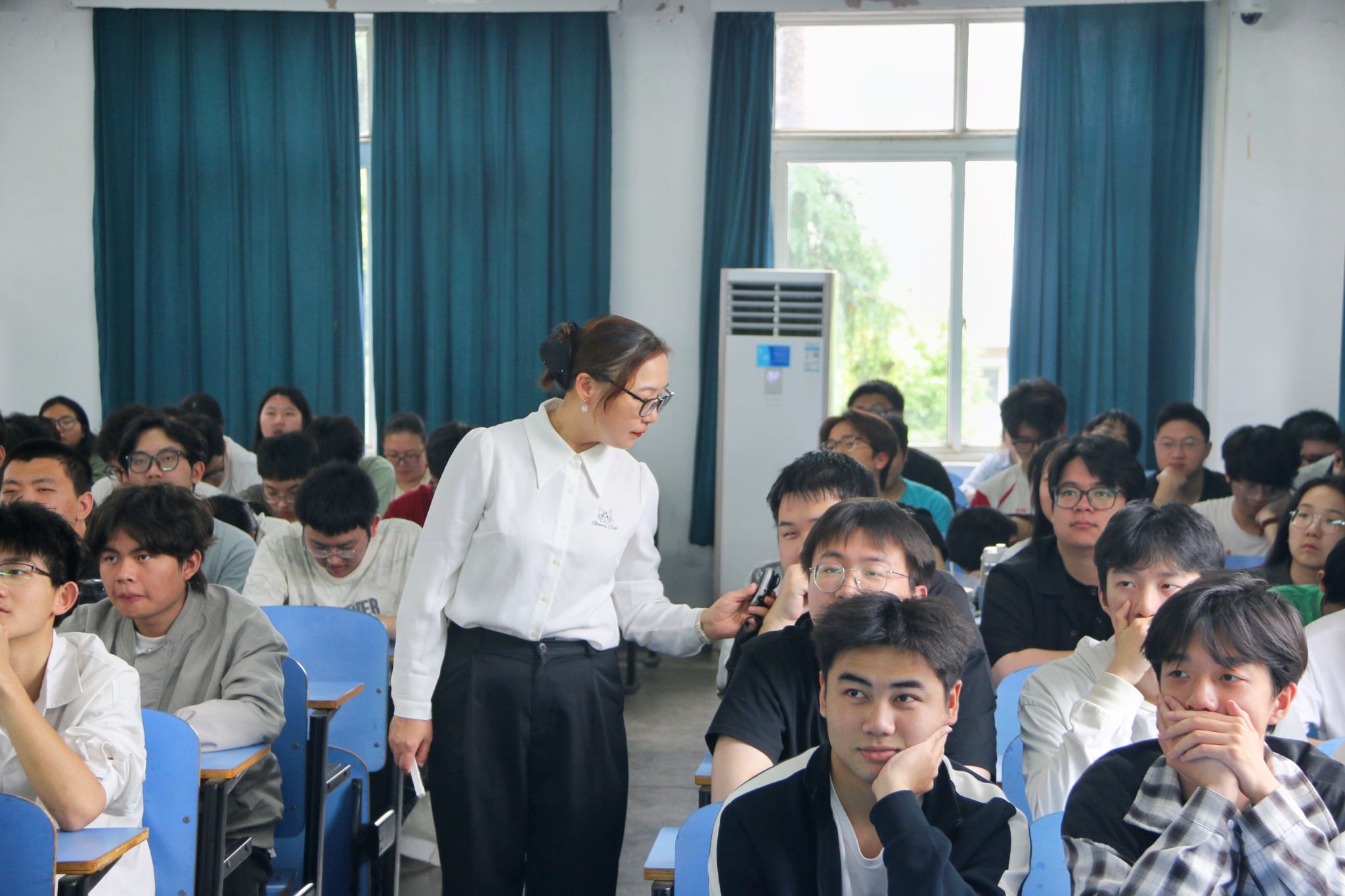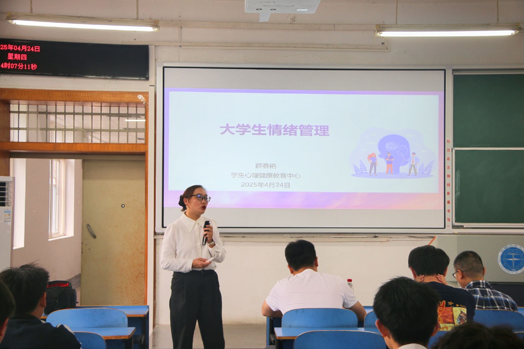 在心理健康教育环节,薛春艳老师做《大学生情绪管理》主题报告,她从手语操《我真的很不错》切入主题,深入剖析情绪的概念、要素、种类,识别情绪困扰的方式和调节情绪的正确方法,引导同学们正确认识情绪、管理个人情绪。课堂过程中,薛老师与同学们充分互动,现场气氛热烈。