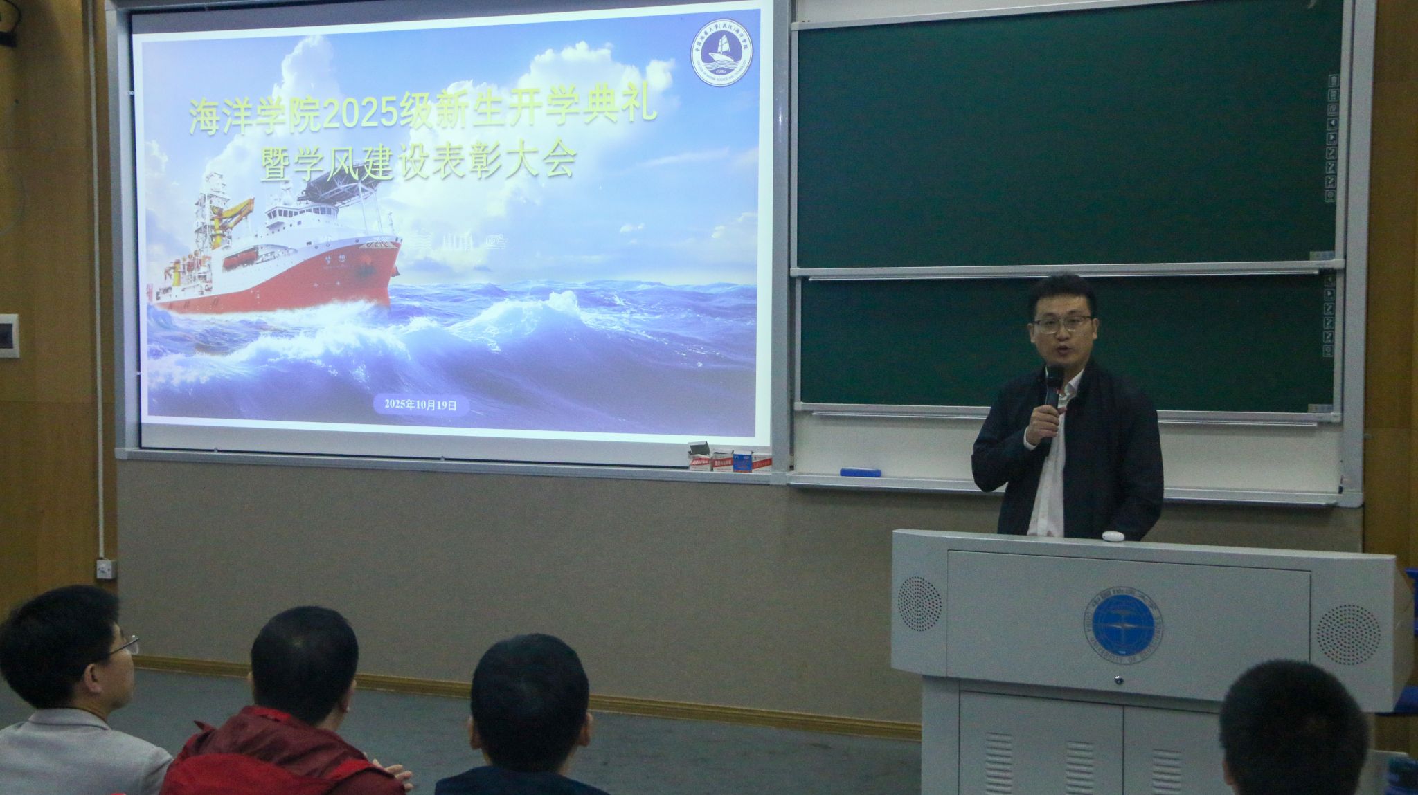 2025级新生开学典礼暨学风建设表彰大会在西区教三楼110教室隆重举行。成人游戏团委书记、辅导员陈波主持典礼,特邀校友代表、广州海洋地质调查局副总工程师沙志彬、党委书记刘国华,副院长孙启良、副院长陈刚、各系主任、教师代表、新生班主任、学生代表以及2025级全体新生共同参加此次典礼。