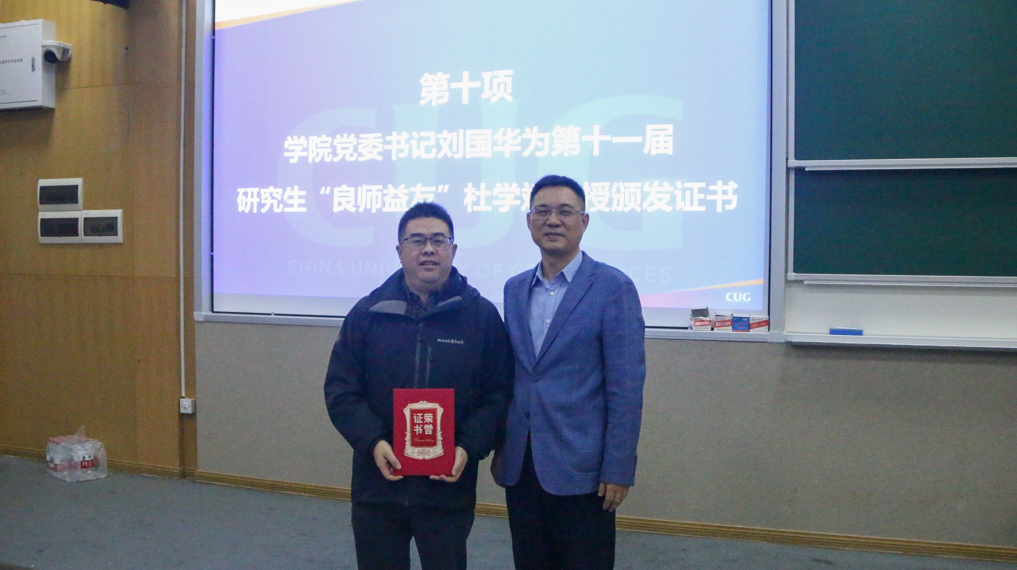 成人游戏党委书记刘国华为第十一届研究生良师益友杜学斌教授颁发证书。
